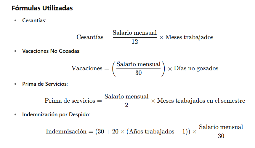 • Días de Vacaciones No Gozadas: Si no tomaste todos tus días de vacaciones, la calculadora calculará una compensación económica.
